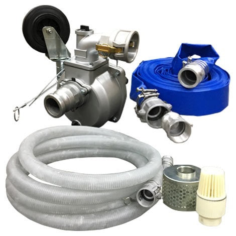 The attachment includes 2’’ suction and discharge hoses, which are 25’ and 50’ long, respectively. Both hoses have aluminum camlock fittings, and one extra camlock fitting is included with the discharge hose. The pump is also fitted with a caster wheel for easy maneuverability.