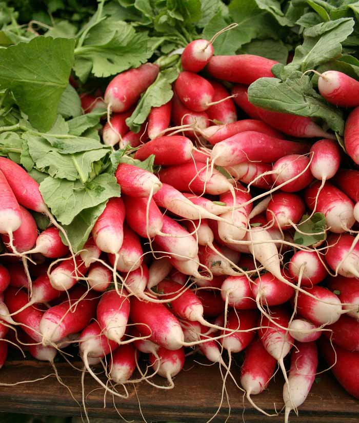 Blunt oblong, 3 inch roots are red, shading to white at the tip. Flesh is crisp, white and mildly pungent; one of the mildest radishes there is. Great home garden variety. Doesn't store well. 24 days.