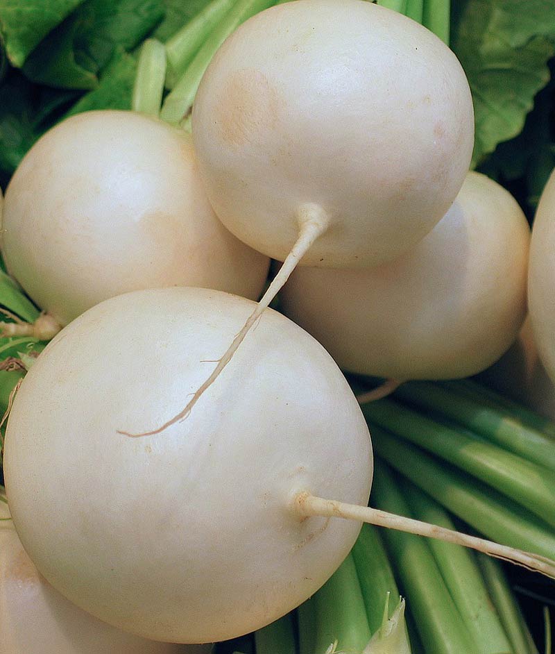 Roots are pure white inside and out. Firm flesh stays crisp for a long time after harvest. Strong dark-green medium-sized tops are larger than most globe types. Begin harvesting radishes when nearly an inch across.