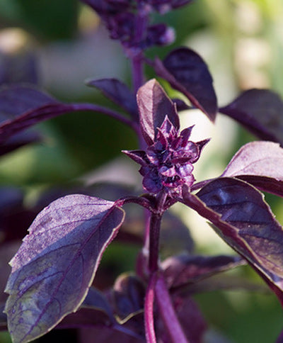 Ornamental and culinary basil with a hint of licorice flavor that is a little more intense than regular basil. Large, glossy, dark purple leaves with ruffled and fringed edges.
