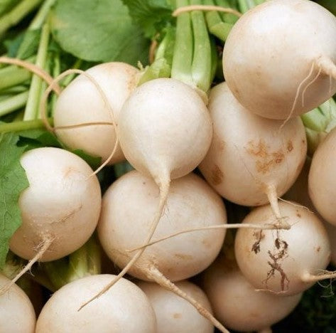 Shogoin Turnip is a Japanese variety grown for both its mild greens and fine-grained roots. The large, white, 6-8" diameter, firm, crisp globe is best when harvested at 3-4". The leafy greens grow to 18- 20"H and can be harvested as tasty leafy greens. They thrive in hot dry weather. These turnips can be pickled, used in soups, stir-fries, or for salads. Turnips are easily grown in containers. Turnip greens are high vitamins A and C. 55 days