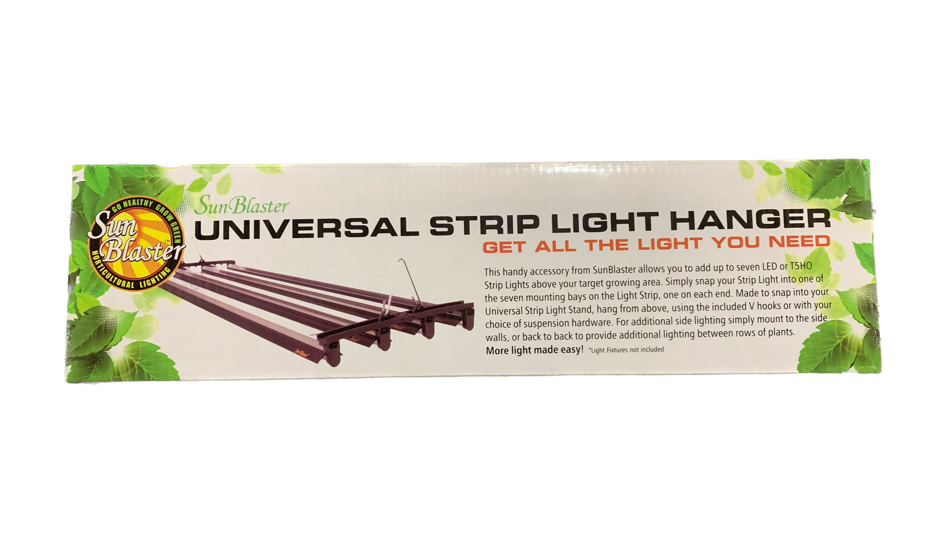 This handy accessory from SunBlaster allows you to add up to seven LED or T5HO Strip Lights above your target growing area. Simply snap your Strip Light into one of the seven mounting bays on the Light Strip, one on each end. Made to snap into your Universal Strip Light Stand, hang from above, using the included V hooks or with your choice of suspension hardware. For additional side lighting simply mount to the side walls, or back to back to provide additional lighting between rows of plants. More light made easy!